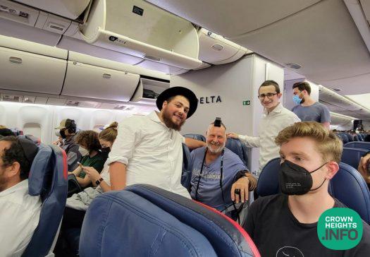 Bochurim Yossi Farro, Shmuly Blesovsky and Betzalel Lebovic were boarding their flight back to LA from their trip in for Gimmel Tammuz, when Yossi asked a 66-year-old man if he was Jewish. When he responded that his mother was, and that he never put on Tefillin, Yossi immediately wrapped him up and said Shema with him.