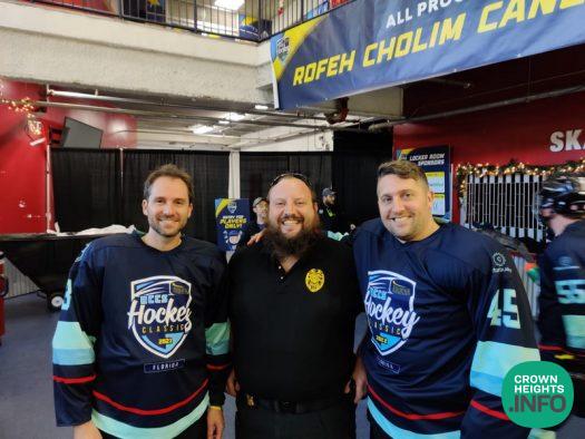 Crown Heights takes the house at the RCCS Annual Hockey Tournament taking place in South Florida today, with three Crown Heights legends. Crown Heights native and Shomrim volunteer Nathan Rieber (right) poses with Fishy Vail (center), another Crown Heights Shomrim volunteer, and Eli Bryski (left), a Hatzalah volunteer whose impact was felt in nearly every Crown Heights home during the COVID-19 Pandemic.
