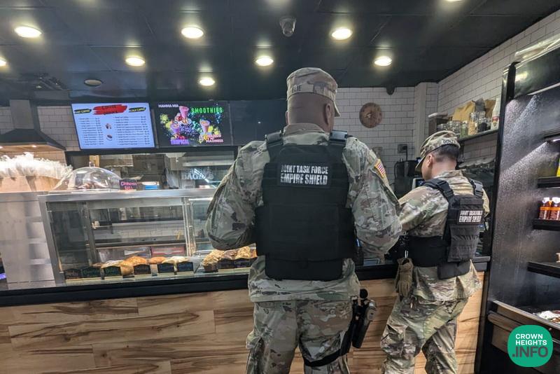 Spotted in Crown Heights. Two National Guardsmen stationed in Crown Heights due to increased security measures stopped by a local store for a bite to eat. The increased security was put in place following a string of high profile assassinations attributed to Israel.