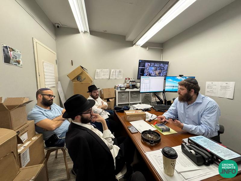 Members of the Vaad Hatmimim’s Tishrei operations team meet with Shmeilach Rosenfeld and Moishy Reichman of Oholei Torah ahead of the onset of Tishrei, to plan for the 1400 bochurim who will be eating daily meals in the Oholei Torah Ballroom.