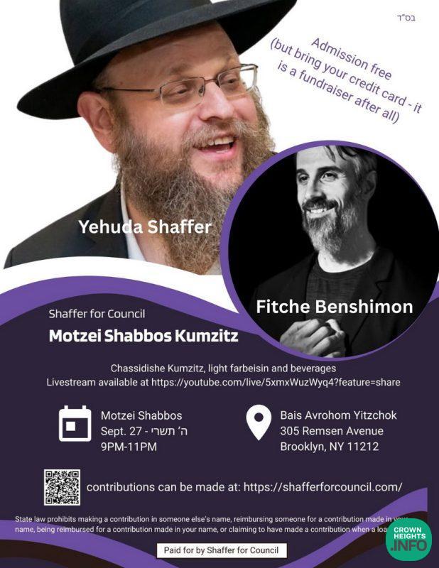 Candidate for New York City Council District 41, Yehuda Shaffer, will be hosting a Kumzitz event this Motzei Shabbos at 9:00pm featuring Crown Heights musician Fitche Benchimon. The in-person event will also be streamed LIVE here on CrownHeights.info.